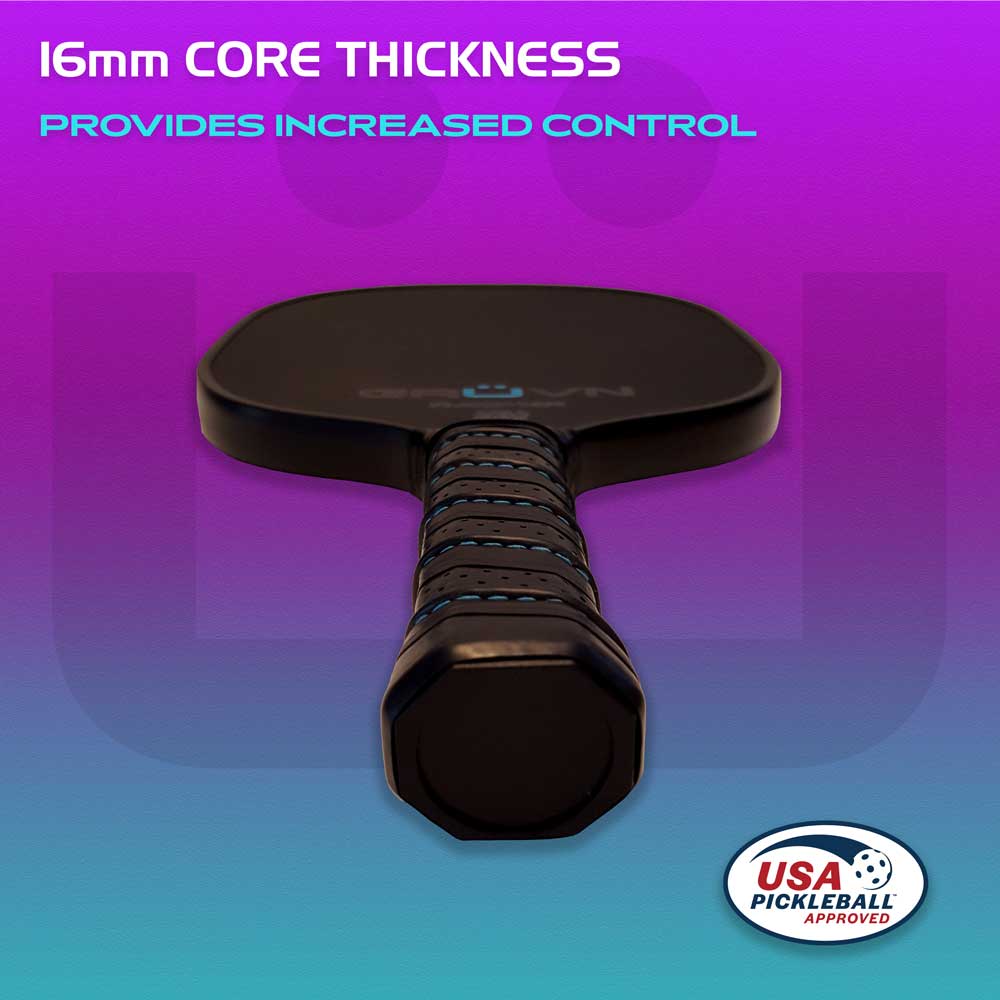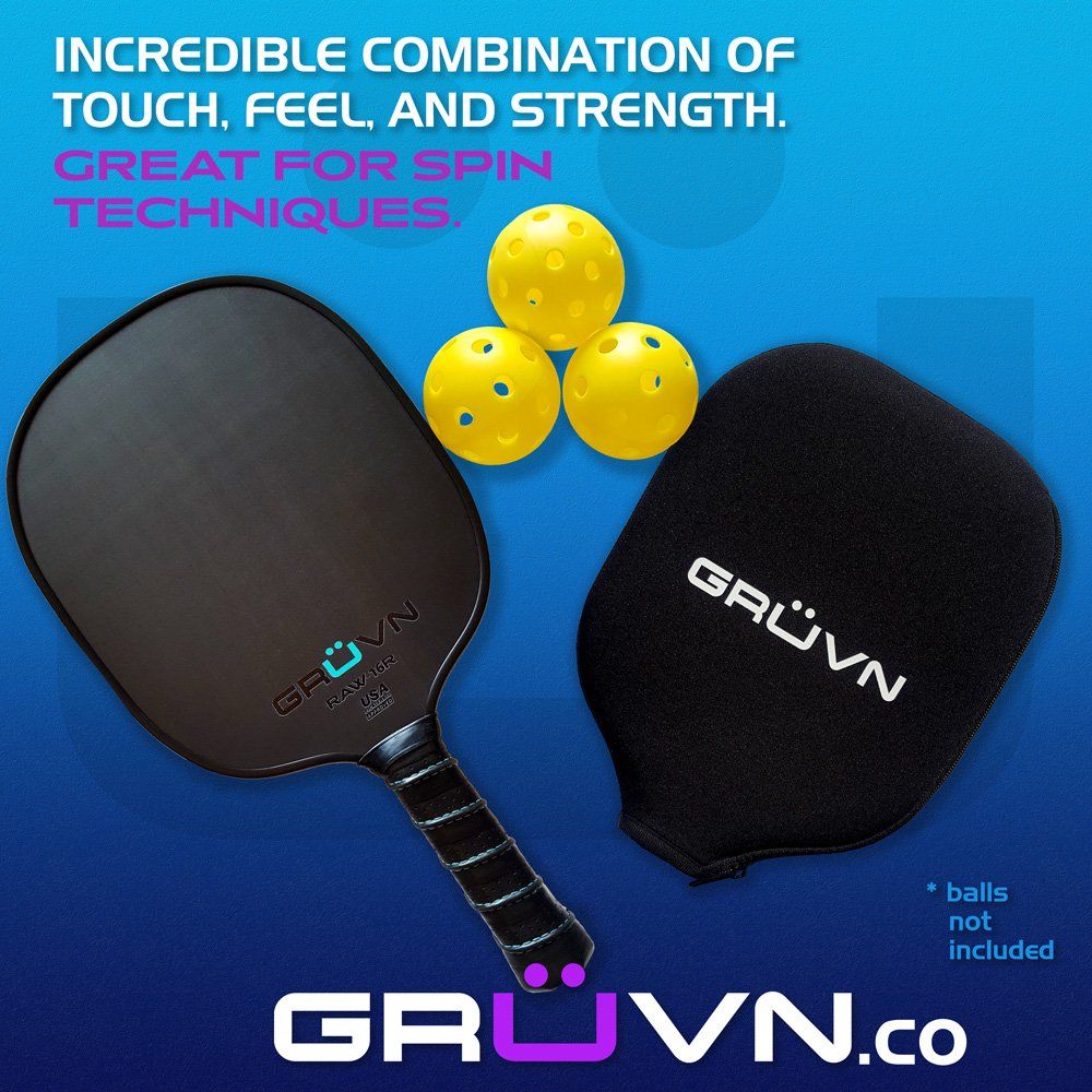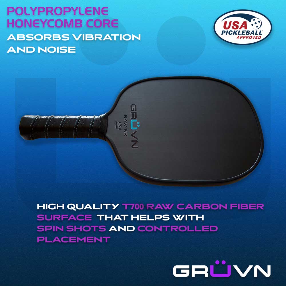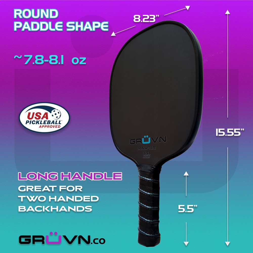GRUVN's RAW-16R (Round shape) is a high-quality, mid-weight pickleball paddle featuring a premium T700 raw carbon fiber surface and a rounded oval shape, similar to a tennis racquet, providing a larger hitting surface.  It is approved by USA Pickleball (USAPA) for tournament play. Raw carbon fiber paddles provide a grainy textured surface that allows for a lot of spin and enhances control. The combination of this paddle’s raw surface and the thick 16mm core results in a strong, stable paddle with consistent and accurate shots and more control.